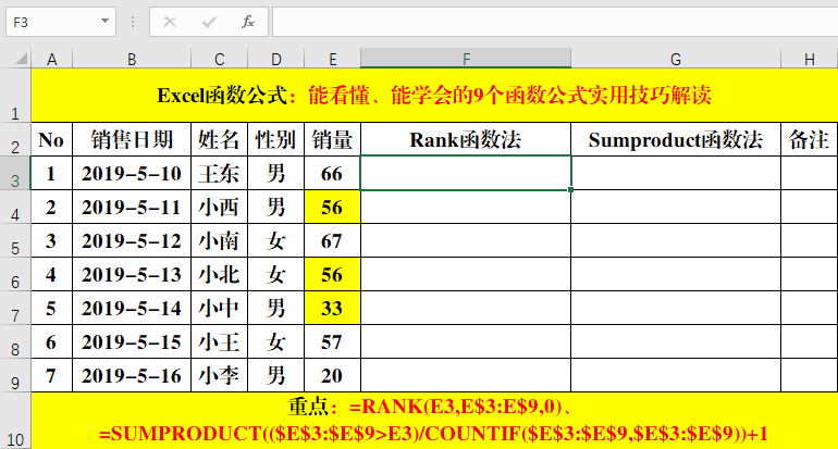 在目標(biāo)單元格中輸入公式:=SUMPRODUCT(($E$3:$E$9>E3)/COUNTIF($E$3:$E$9,$E$3:$E$9))+1。