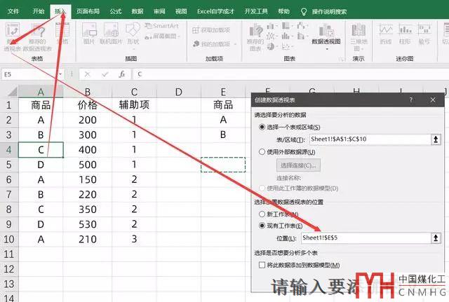 這個時候我們選中單元格,插入數據透視表,為了方便數據查看,我們將位置放在空白處,如E5單元格