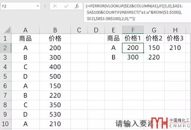=IFERROR(VLOOKUP($E2&COLUMN(A1),IF({1,0},$A$1:$A$100&COUNTIF(INDIRECT("a1:a"&ROW($1:$100)),$E2),$B$1:$B$100),2,0),"")