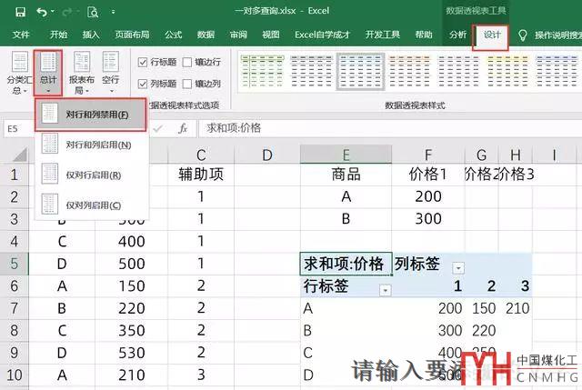最后我們調整數據透視表的樣式,在設計里面,找到總計,對行和列都進行禁用