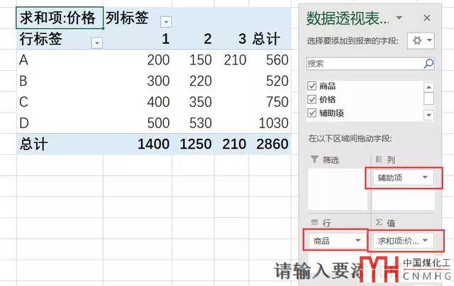 然后我們將商品放在行標簽,將輔助項放在列標簽,把金額放在值里面,得到的結果如下所示: