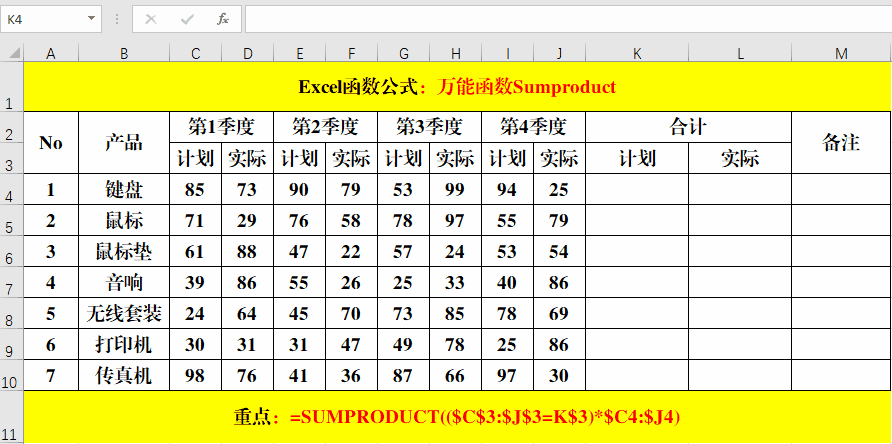 在目標單元格中輸入公式:=SUMPRODUCT(($C$3:$J$3=K$3)*$C4:$J4)。