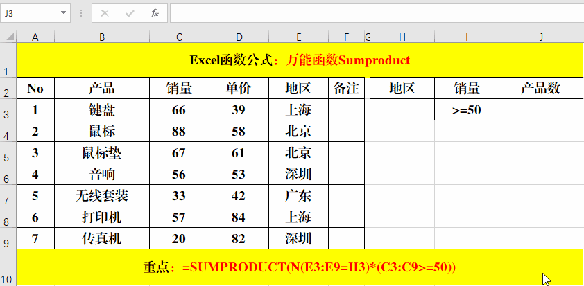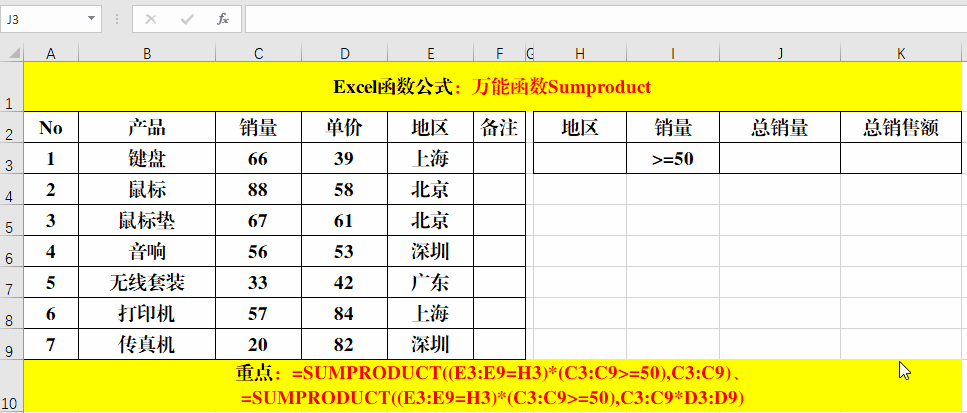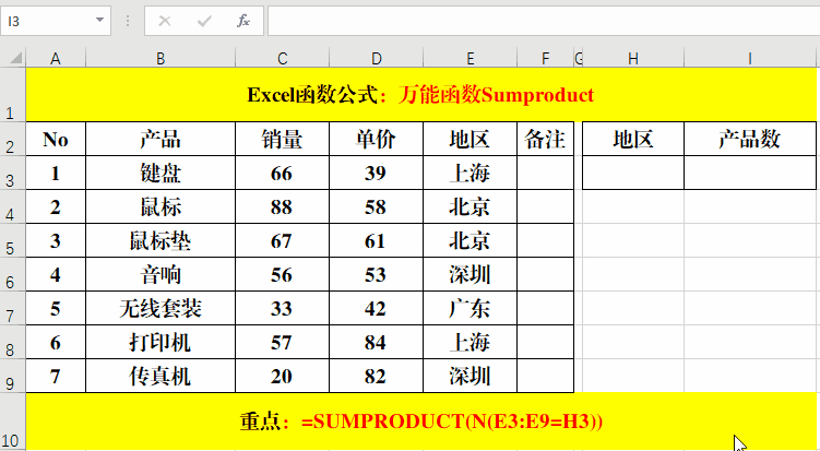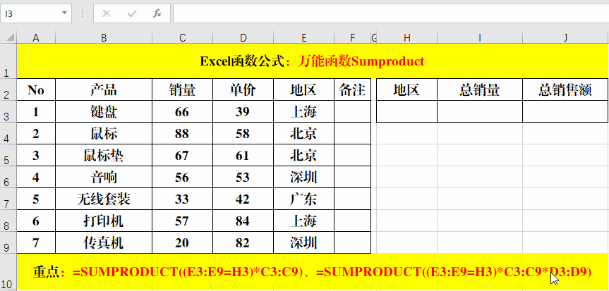 2、以“上海”地區(qū)的為例:公式=SUMPRODUCT((E3:E9=H3)*C3:C9)的計算過程就是:1*66+0*88+0*67+0*56+0*33+1*57+0*20=123。公式:=SUMPRODUCT((E3:E9=H3)*C3:C9*D3:D9)的計算過程就是:1*66*39+0*88*58+0*67*61+0*56*53+0*33*42+1*57*84+0*20*82=7362。