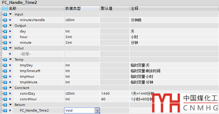 FC_Handle_Time2用來(lái)將總時(shí)間的分鐘數(shù)轉(zhuǎn)換成直觀的*天*小時(shí)*分鐘的形式,變量聲明部分如下圖所示: