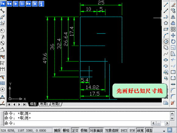 這張圖還比較復雜,條件比較多,可以先按橫縱向這些尺寸將輔助線畫好,先定位明確的圓或弧,在利用他們定位剩余的線,必要時需要利用輔助線。