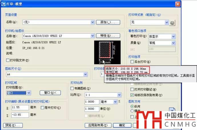 A4的標(biāo)準(zhǔn)圖框大小是210×297,而A4的紙張也是210X297,如果要1:1打印,圖框的邊線必須正好打印到紙張的邊界上,用過(guò)這種A3和A4這種打印機(jī)的人都應(yīng)該知道,打印機(jī)在打印的時(shí)候都會(huì)留一定寬度的空白邊界,也就是A4紙張的實(shí)際有效打印區(qū)域200×287左右(不同打印機(jī)可能不太相同),也就是四周都有10毫米的空白區(qū)域,因此標(biāo)準(zhǔn)的A4圖框是不可能按1:1打印到A4的紙張上的。這個(gè)從打印對(duì)話框里就能看出來(lái),在打印對(duì)話框中有個(gè)小的預(yù)覽框,可以顯示紙張尺寸和可打印區(qū)域,并可以紅線顯示圖形在哪些方向超出打印區(qū)域,如下圖所示。