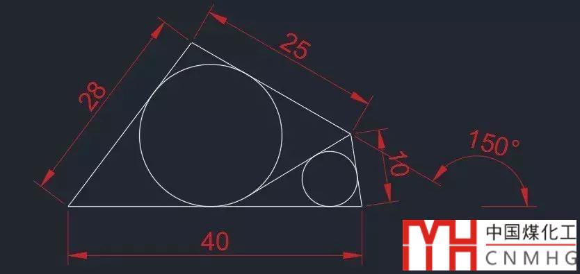 這張圖看起來條件很充足,但又感覺誰跟誰都不挨著,長度40的線是水平的,這個可以先畫,長度25的線跟水平方向呈150度,跟水平線端點間的距離分別是28和10,難點就在這兒,到底這個25的線怎么定位才能滿足這個條件呢?考試題中類似的題很多,假設(shè)我們要畫一個知道各邊長度的三角形,利用輔助圓可以快速得到我們的圖形,這張圖也必須利用輔助圓,下面我們就看一下繪圖的基本方法,知道這種方法后,遇到類似的圖紙照葫蘆畫瓢就可以了。