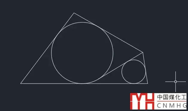 很顯然直線的這個位置是滿足我們條件的,剩下的工作就簡單了,兩個作為輔助線的圓已經(jīng)完成任務(wù),可以刪除了,連接斜線和水平線的端點,然后用相切相切相切的方式線畫好左側(cè)的圓,然后從斜線右側(cè)端點畫圓的切線,然后再用相切相切相切畫另一個圓,這些都是常規(guī)操作,步驟就不在細(xì)講了,就得到了如下圖所示圖形。
