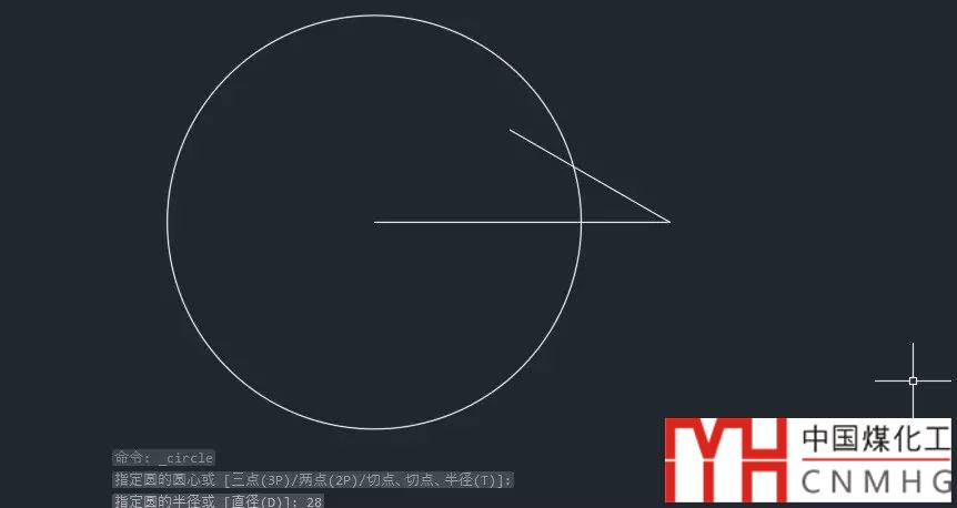 3、以水平線的左側(cè)端點為圓心,畫一個半徑為28的圓,如下圖所示。