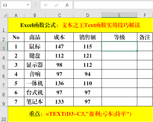 在目標單元格中輸入公式:=TEXT(D3-C3,"盈利;虧本;持平")。