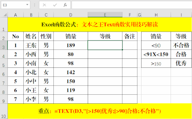 在目標單元格中輸入公式:=TEXT(D3,"[>150]優(yōu)秀;[>90]合格;不合格")。