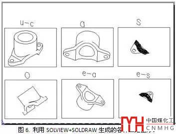 SOLVIEW+SOLDRAW與SOLPROF功能類似,都是生成三維實體的二維輪廓線,SOLVIEW+SOLDRAW選項更多、操作更復(fù)雜,當(dāng)然也更靈活、更強(qiáng)大,可以方便地生成三維模型的三視圖、軸測試圖及剖視圖,如下圖所示。
