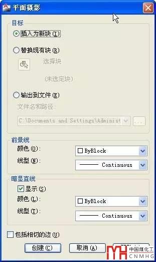 這是專門針對模型空間設(shè)計的三維轉(zhuǎn)二維的命令,選中三維實體并執(zhí)行FLATSHOT命令后,軟件會彈出也給對話框,在對話框中可以設(shè)置為將投影生成為塊還是輸出為文件,如下圖所示。