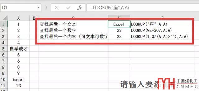 查找最后一個(gè)文本:LOOKUP("座",A:A)