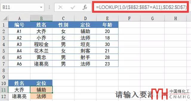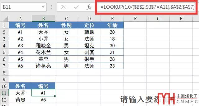 公式:=LOOKUP(1,0/(A11=$B$2:$B$7),$A$2:$A$7)