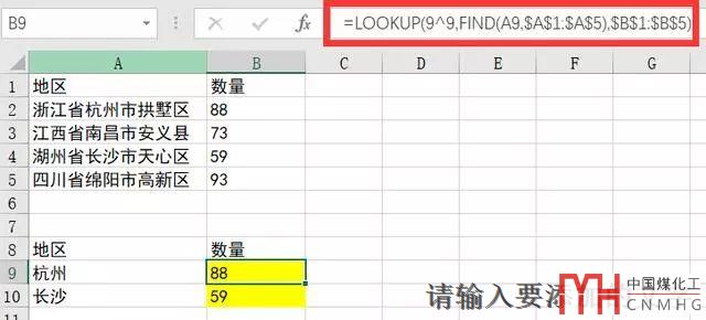 公式:=LOOKUP(9^9,FIND(A9,$A$1:$A$5),$B$1:$B$5)