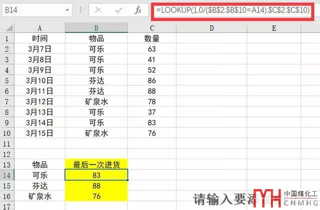 公式:=LOOKUP(1,0/($B$2:$B$10=A14),$C$2:$C$10)