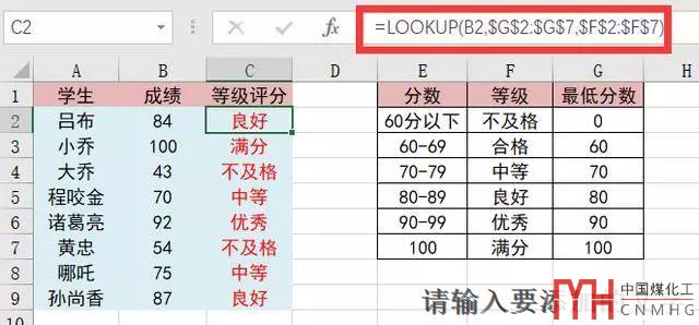公式:=LOOKUP(B2,$G$2:$G$7,$F$2:$F$7)