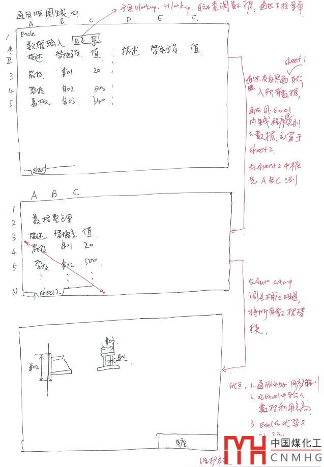 參數(shù)化生成圖紙可以做到這一點,但是程序的編制量比較大,實現(xiàn)起來周期較長。在和一些單位的交流過程中,發(fā)現(xiàn)大部分單位的工程師都有良好的Excel使用技巧。能夠熟練的使用EXCEL的一些高級命令,比如hlookup和vlookup實現(xiàn)聯(lián)合查找,使用EXCEL的一些函數(shù)做復雜的計算書,甚至對VBA也很精通,那么一個念頭就生成了,能否用EXCEL做啞圖的輸入界面,輸入完成后,讀取EXCEL中的數(shù)據(jù),在Autocad中自動填寫這些數(shù)據(jù),實現(xiàn)啞圖的自動生成?