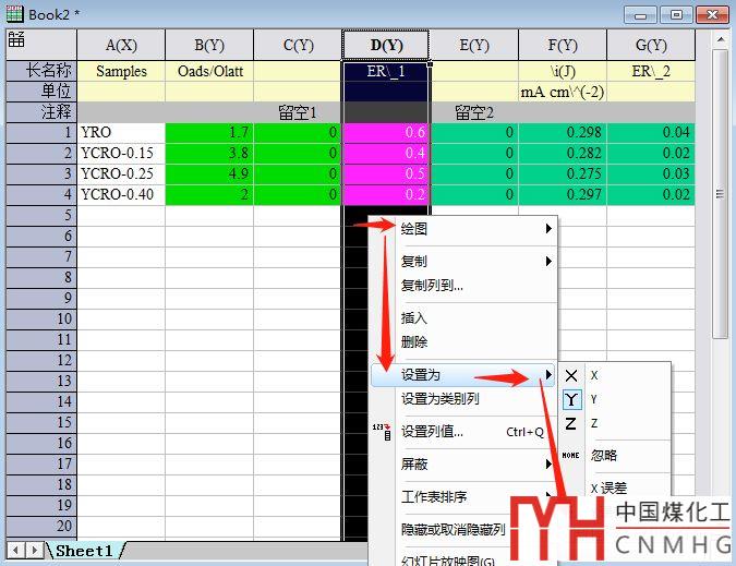 設(shè)置步驟:點(diǎn)擊誤差數(shù)據(jù)列標(biāo)頭選中誤差數(shù)據(jù),右鍵選擇Set as再選擇Y error(Y誤差)。具體步驟見(jiàn)前面的圖2。
