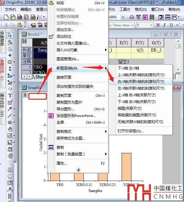 在已經(jīng)繪制出的圖的左上角1的右邊附近空白區(qū)域點(diǎn)擊右鍵,選擇“New Layer(Axes)”,再選擇“Right-Y(linked X scale and Dimension”,可以得到第二個(gè)空白圖層。