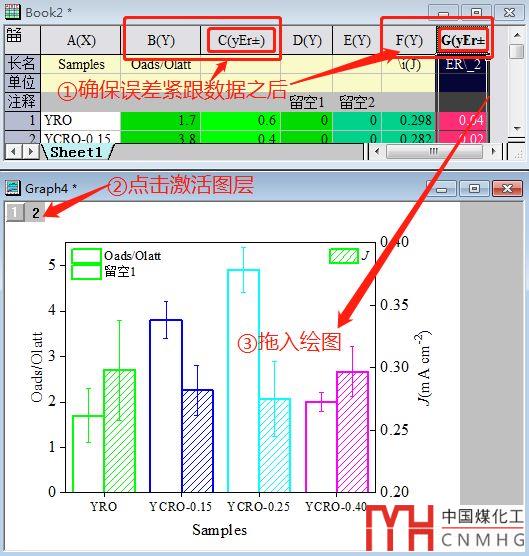 首先,確保誤差數(shù)據(jù)列被Set as Y error,并且緊跟相應(yīng)數(shù)據(jù)列之后;然后點(diǎn)擊圖層序號(hào) 1 或2;最后將yEr±數(shù)據(jù)列拖入繪圖。