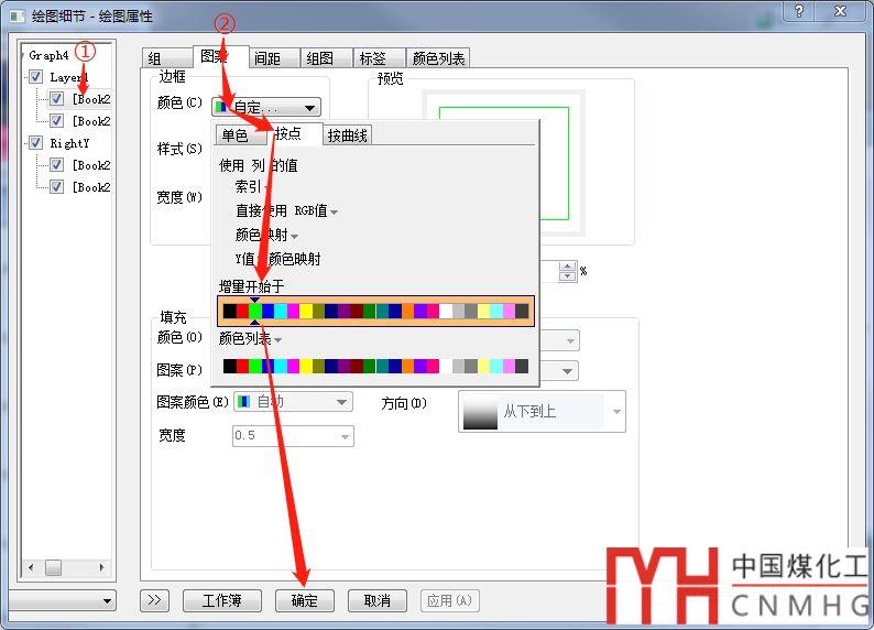 具體的設(shè)置步驟如圖8所示,首先選擇圖層1(Layer1)下方的第一條(綁定狀態(tài)的參數(shù)都是在第一條目中設(shè)置),然后點(diǎn)擊圖層,設(shè)置“邊框”-自定義-按點(diǎn)-增量開(kāi)始于,最后確定。Origin2018已經(jīng)有很好的配色方案供我們選擇,這里設(shè)置每個(gè)點(diǎn)(不同樣品)的顏色不同,可以設(shè)置從某種配色方案的某種顏色開(kāi)始的起始顏色(譚編稱之為“起色”)。