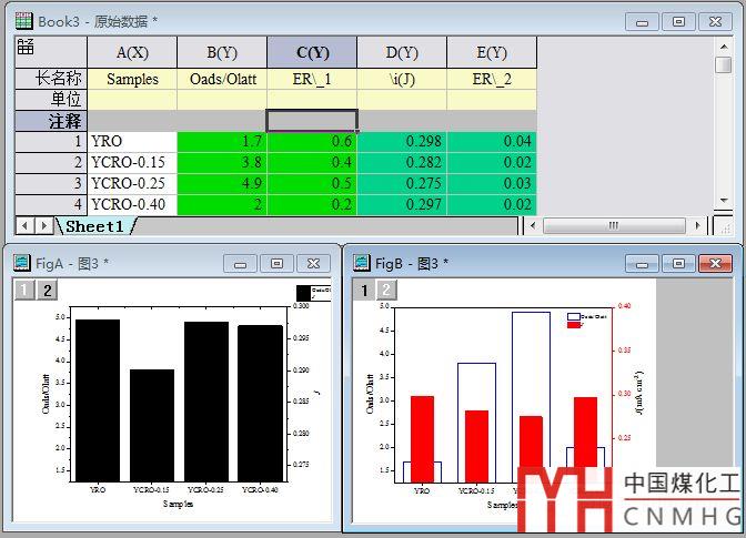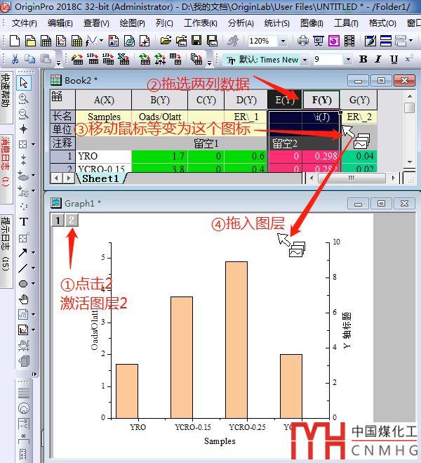 我們以4個(gè)樣品的兩組不同數(shù)量級(jí)的Y數(shù)據(jù)及Yerr誤差數(shù)據(jù)為例,數(shù)據(jù)表包含一列共用的X列(Samples),以及Y、ER、留空三列數(shù)據(jù)。