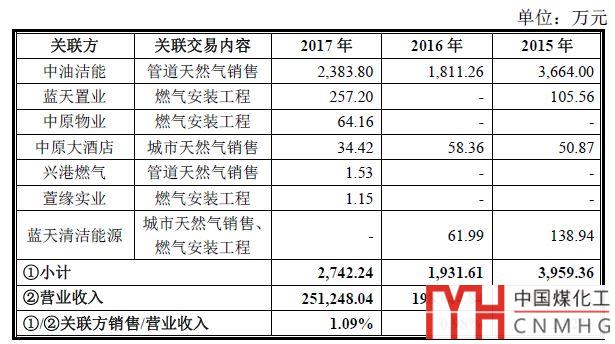 根據(jù)藍天燃氣招股書披露,2015-2017年向關聯(lián)方出售商品/提供勞務的交易金額分別 3,959.36 萬元、1,931.61 萬元、2,742.24 萬元,占營業(yè)收入的比重分別為 1.92%、0.98%、1.09%。
