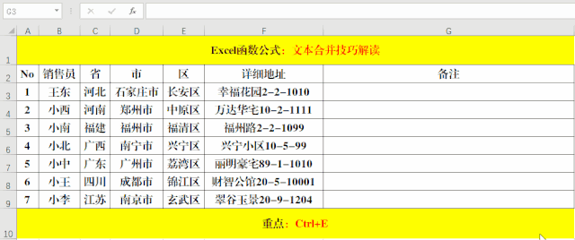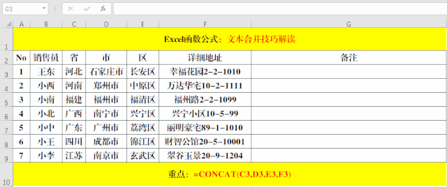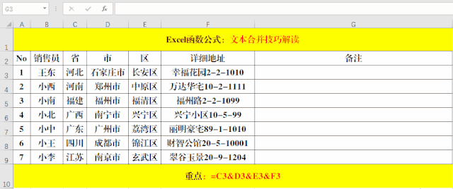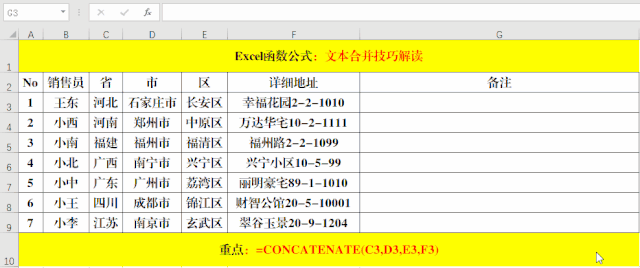 目的:將“省”、“市”、“區(qū)”、“詳細(xì)地址”合并到一個(gè)單元格中。