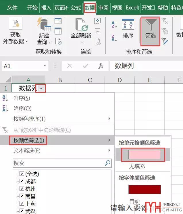 這個時候所有的重復(fù)數(shù)據(jù)都會被標(biāo)記為一個顏色,我們點(diǎn)擊數(shù)據(jù)選項(xiàng)卡的篩選,然后在數(shù)據(jù)列的右邊按顏色進(jìn)行篩選,選擇一種顏色