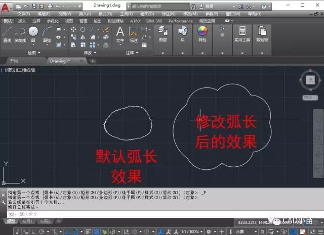 執(zhí)行云線命令后,輸入A,回車,就可以設置最小弧長,默認的弧長是0.5,我們可以手動輸入最小弧長,也可以在圖中通過定義兩點來定義弧長。最小弧長設置合適的話,云線的圓弧段會減少很多,如圖所示。