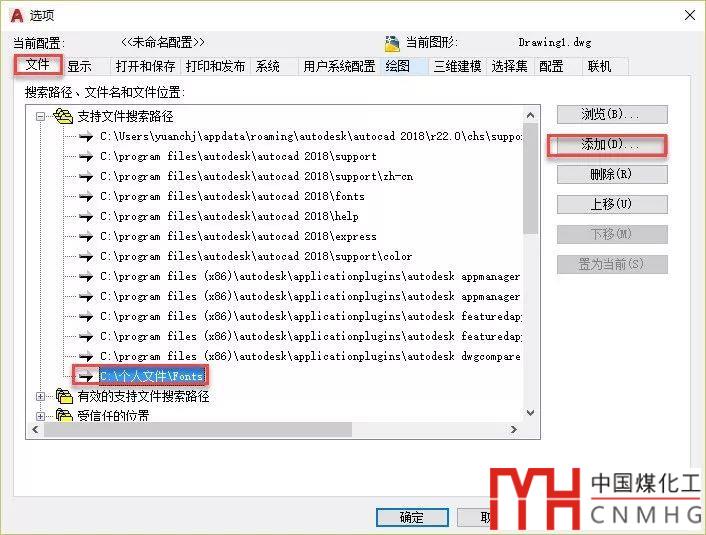 我將自己分享的字庫放到一個(gè)目錄下,然后再ACAD的選項(xiàng)對話框OP中文件選項(xiàng)卡中將字體目錄添加到支持文件搜索路徑下,如下圖所示。