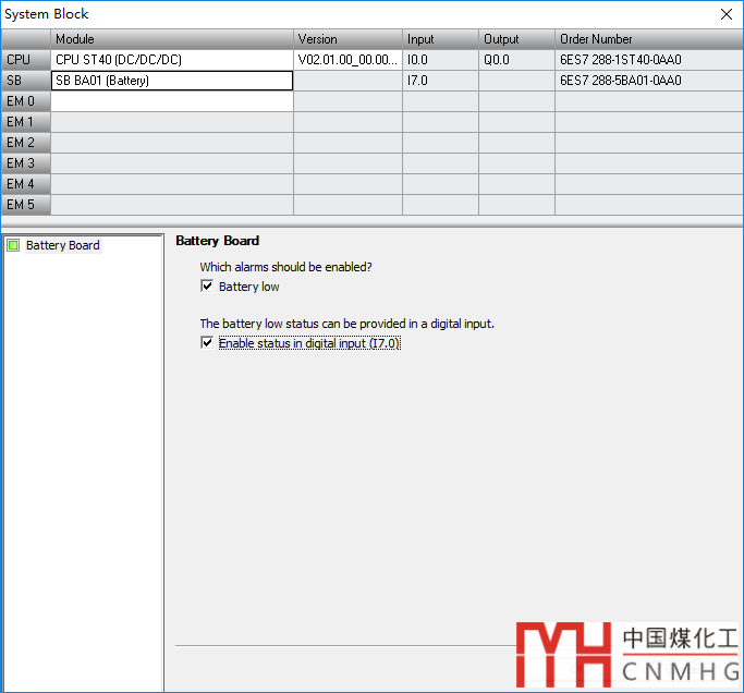 電池板可以插到標(biāo)準(zhǔn)型CPU的信號(hào)板插槽中,不需要額外的接線。但是需要在硬件中組態(tài)并下載到CPU中,如下圖: