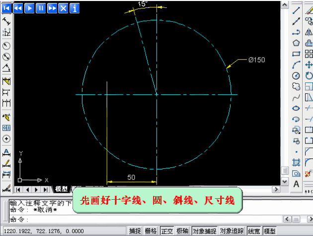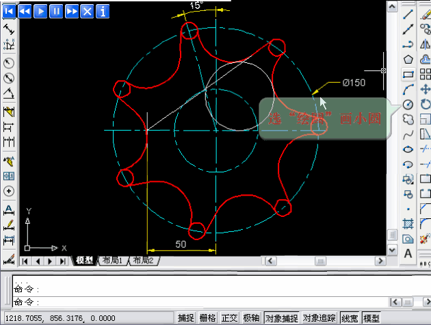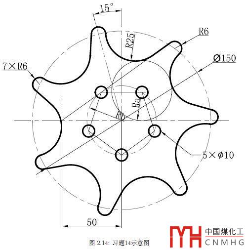 這張圖看著有點(diǎn)復(fù)雜,其實(shí)也不難,畫(huà)個(gè)直徑150的圓,畫(huà)一條豎直的半徑,然后向一側(cè)旋轉(zhuǎn)15度,然后畫(huà)小圓,環(huán)形陣列7個(gè),然后用相切相切半徑畫(huà)R25的圓弧,可以先畫(huà)一下,不會(huì)或者要對(duì)答案再看下面的視頻。