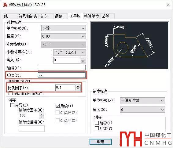 輸入D,回車(chē),重新修改ISO-25的標(biāo)注樣式,將后綴設(shè)置成cm,將測(cè)量單位比例的比例因子設(shè)置成0.1,如圖所示。