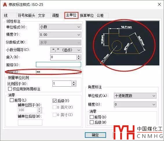 單擊“主單位”選項(xiàng)卡,在后綴文本框中輸入mm,如圖所示。