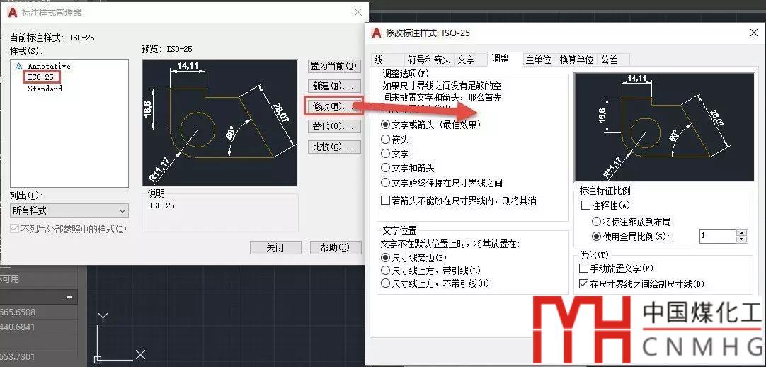 輸入D,回車(chē),打開(kāi)標(biāo)注樣式管理,選擇ISO-25標(biāo)注樣式,單擊“修改”按鈕,打開(kāi)修改標(biāo)注樣式對(duì)話框。