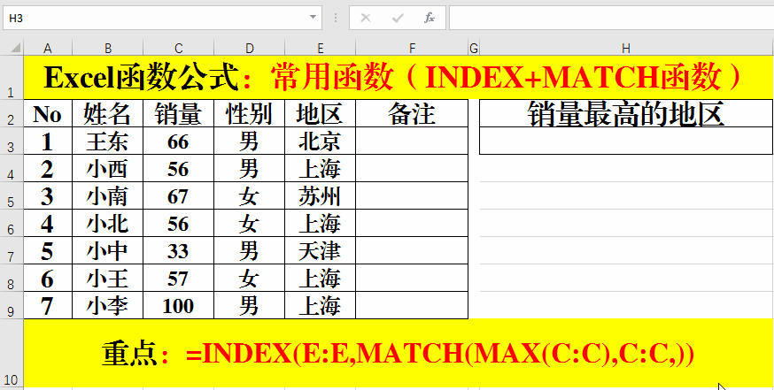 三、INDEX+MATCH組合函數:返回銷量最高的地區(qū)