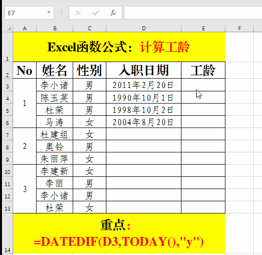 2、在單元格中輸入公式:=DATEDIF(D3,TODAY(),"y")。