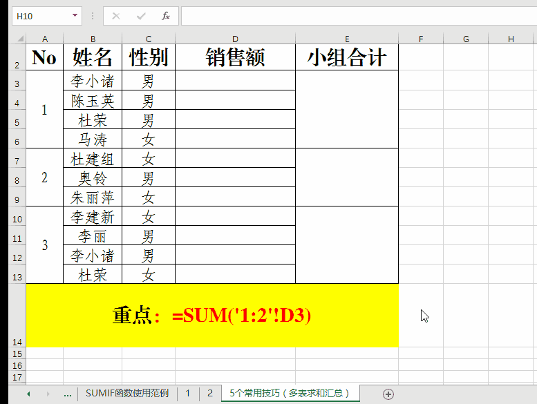 2、在目標(biāo)單元格中輸入公式:=SUM('1:2'!D3)。