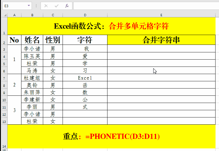 在目標(biāo)單元格中輸入公式:=PHONETIC(D3:D11)。