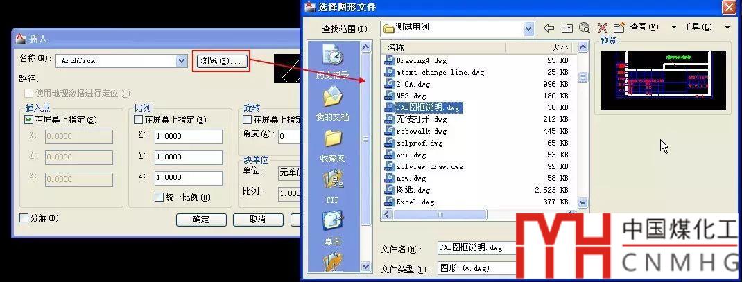 插入I命令還可以瀏覽插入其他的DWG文件(可以是寫塊W命令寫的塊文件,也可以是普通的圖紙文件),插入文件作為圖塊的操作類似,只需在插入對話框中點(diǎn)瀏覽按鈕,瀏覽找到文件,其他操作完全一樣,如下圖所示。