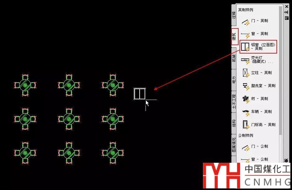 單擊一個選項(xiàng)卡,如建筑,選擇一類圖塊,單擊其中一個圖塊的圖標(biāo),然后將光標(biāo)移動到圖形窗口中,我們就可以看到選中的圖塊跟隨光標(biāo)移動到了圖形窗口中,如下圖所示。