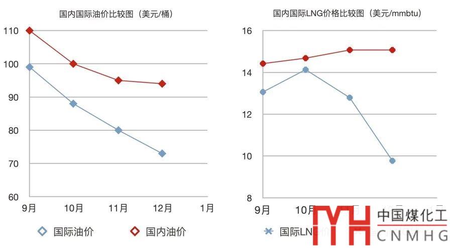 比政策對比更值得讓人深思的,是兩場“運動”的受挫原因。 下面兩組圖,第一組是2014年年底的國內外油、氣價格走勢圖,而2014年是“油改氣”發(fā)展由盛轉衰的轉折之年,第二組則是2017年年底的國際國內天然氣(LNG)價格走勢圖,那一年的氣荒,相信每一個從業(yè)者都會記憶猶新。 比較兩張圖,國際油價狂跌之后國際LNG價格立即跟跌,跌幅甚至更大,價格反應時間僅一個月;然而國內的油氣價格變化卻非常耐人尋味:油價跟跌,但跌幅小了一些,表明我們的自產油以及國家價格機制抑制了跌幅,這很好理解,令人費解的是國內LNG價格,不跌反漲,使得LNG價格相比跌價后的汽柴油,毫無競爭優(yōu)勢。憤怒的卡車司機們,甚至不惜再花錢“氣改油”,來表達自己的失望。