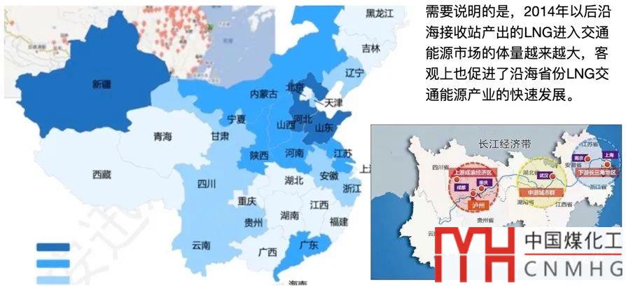 人口數(shù)量和GDP占比傳遞的訊息很清晰:沿長江中部地區(qū),具備了天然氣應用大幅增長的基礎條件,而沿長江、京港澳、滬昆以及二連浩特至北部灣這四條物流大動脈,則表明LNG進入交通能源的市場條件非常成熟。