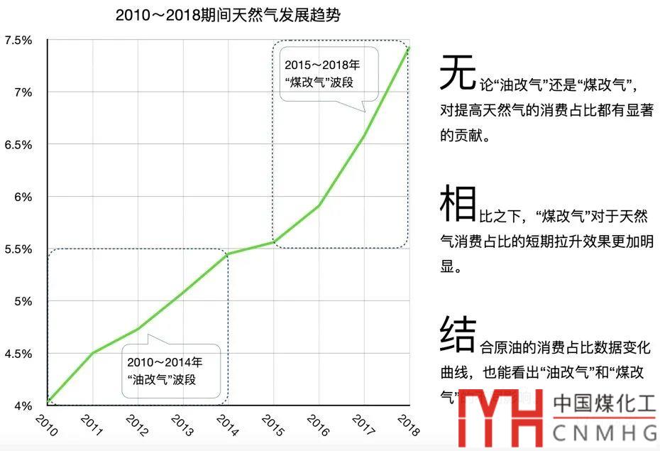 通過對以上圖表的解讀,宏觀成果非常明顯:從2010年到2018年,煤炭在一次能源消費中的占比從70.45%降到了58.25%,天然氣的占比則從4.03%上升到了7.43%。