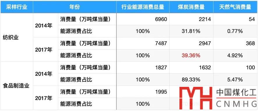 需要說明一點:本文只為探究和闡述“煤改氣”的產業(yè)發(fā)展規(guī)律,因此沒有花更多精力梳理近兩年的數(shù)據(jù),直接采用了2016年的表格。采樣紡織業(yè)和食品制造業(yè)來分析比較2014年數(shù)據(jù)(來自“中國數(shù)據(jù)年鑒2016”)和2017年的數(shù)據(jù)(來自“中國數(shù)據(jù)年鑒2019”),可以看出2015年以后的這輪“煤改氣”運動,很多工業(yè)行業(yè)的天然氣利用取得了卓有成效的成果,但工業(yè)燃料的散煤替代仍然存在巨大的市場空間。(宏觀看:2017年全國散煤消減6500萬噸,2018年全國散煤消減6100萬噸。)