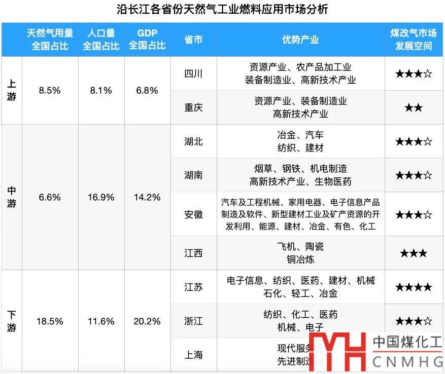 很明顯,能源成本在產出價值中占比很高的行業(yè),像煤炭開采、金屬加工等等,接受能源升級的難度較高;而在食品加工、制藥等行業(yè)中,能源成本占比不高,比較容易接受“煤改氣”。 對能源替代的價格敏感度,實際上也對天然氣資源的“供”提出了要求。拿這一點與交通能源市場作比較,結論也很有趣:對價格敏感度更低的交通能源市場,更在乎供給的保證和穩(wěn)定,而看上去對資源要求比較孤立的工業(yè)燃料市場,恰恰對價格的敏感度很高。 綜上,各工業(yè)的煤炭消費量、各工業(yè)氣代煤的成果與現(xiàn)狀、各工業(yè)對能源替代的價格敏感度這三組數(shù)據(jù),精準定位了我們苦心尋找的天然氣工業(yè)燃料應用的產業(yè)密碼。 有了導航,我們依舊把沿長江區(qū)域設為目的地,來演練其“煤改氣”發(fā)展是否能夠“星垂平野闊,月涌大江流”。