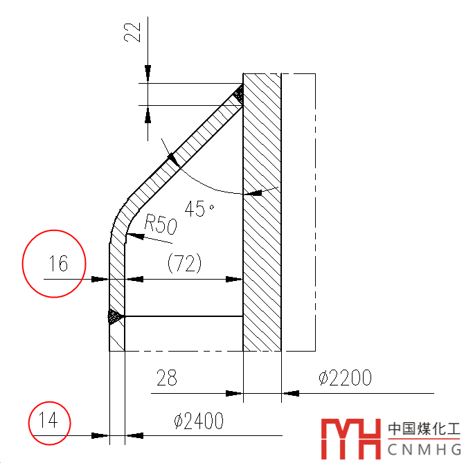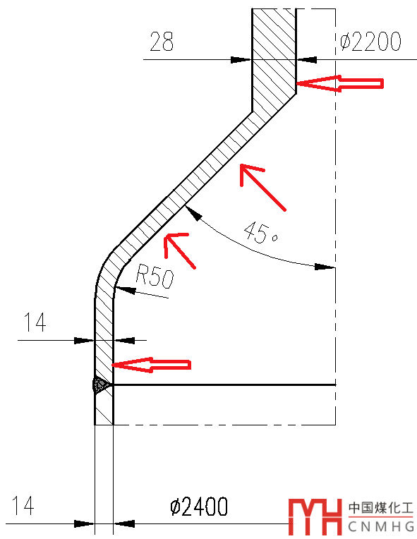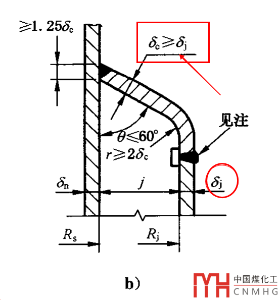 在看圖時(shí),發(fā)現(xiàn)圖紙夾套錐殼和夾套筒體的厚度不一樣,夾套錐殼16mm,夾套筒體取值是14mm。